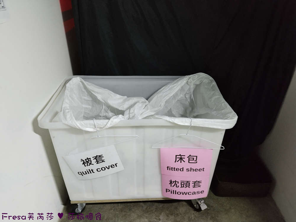 (退房拆下枕頭套、被套、床單放回收箱)