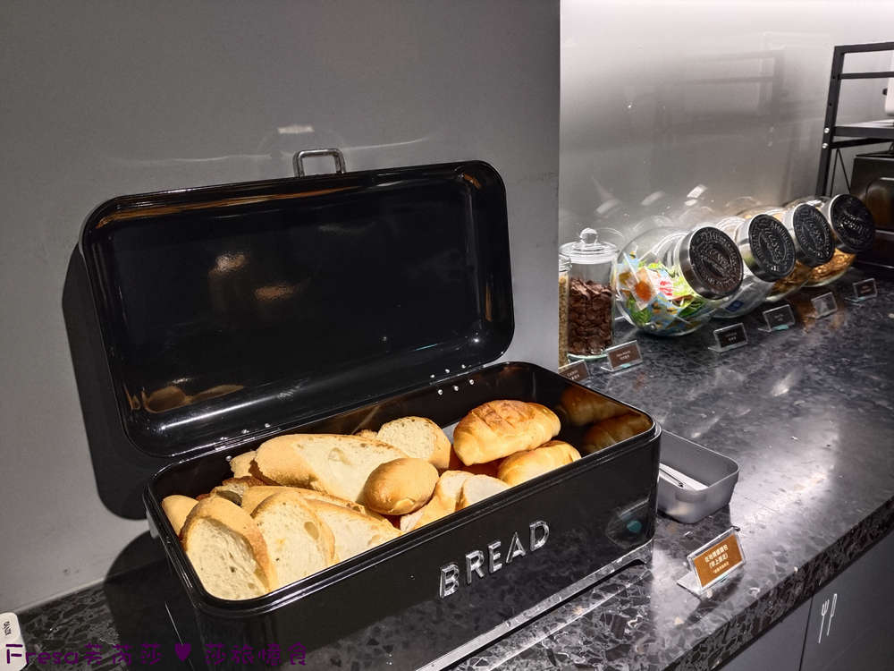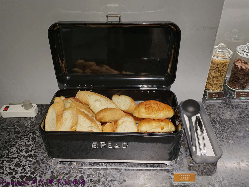 隔天早上,在一樓廚房提供免費可頌和麵包.