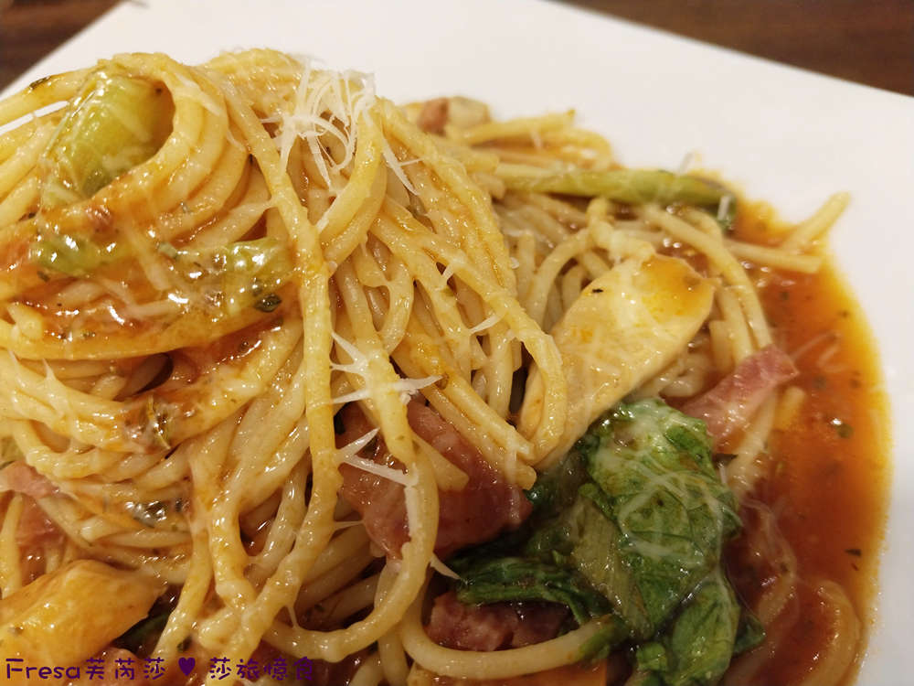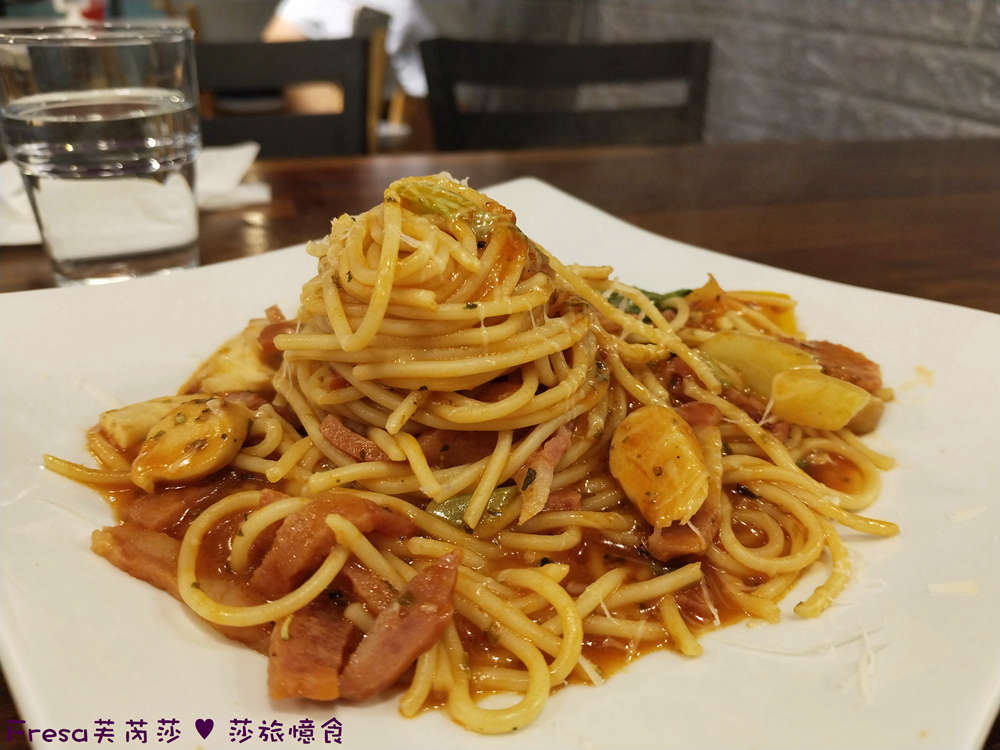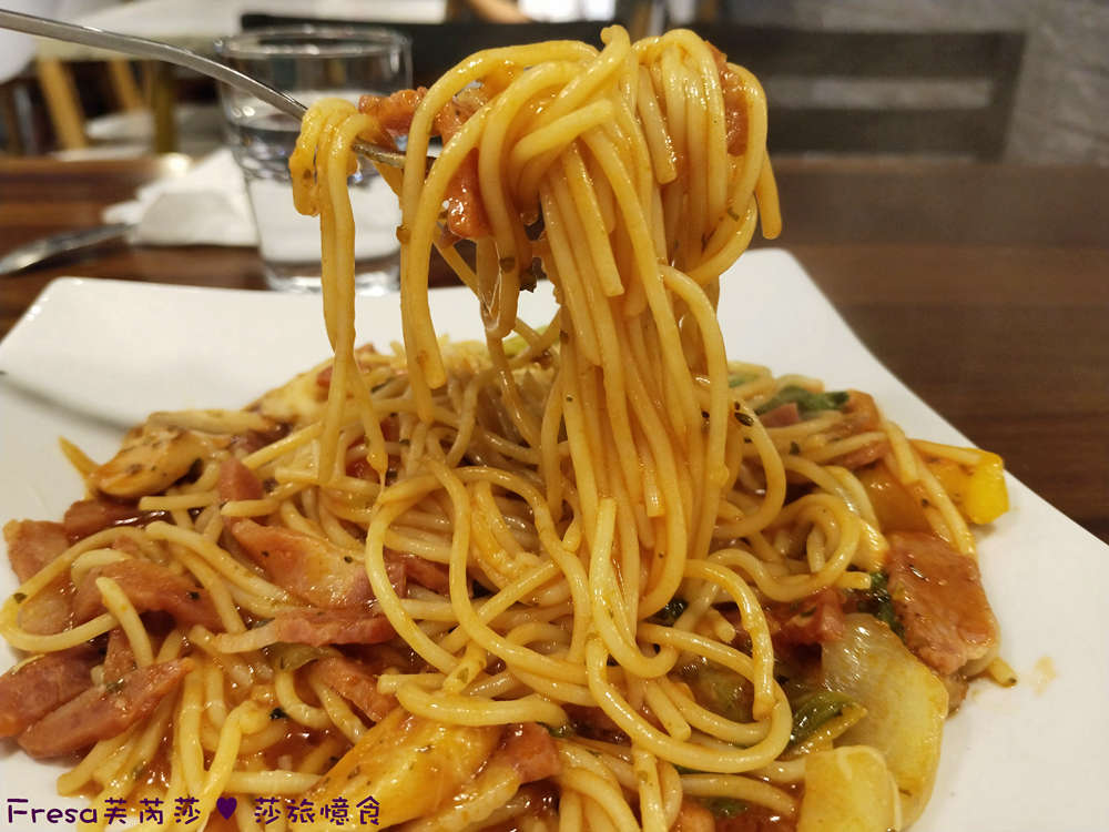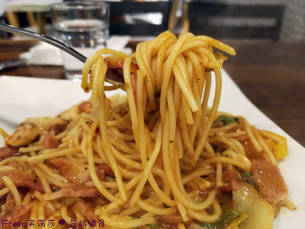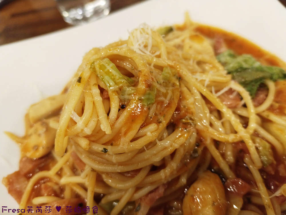 義大利麵帶有微微嚼勁,吸收番茄酸香很夠味.