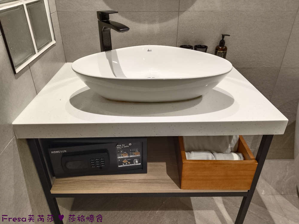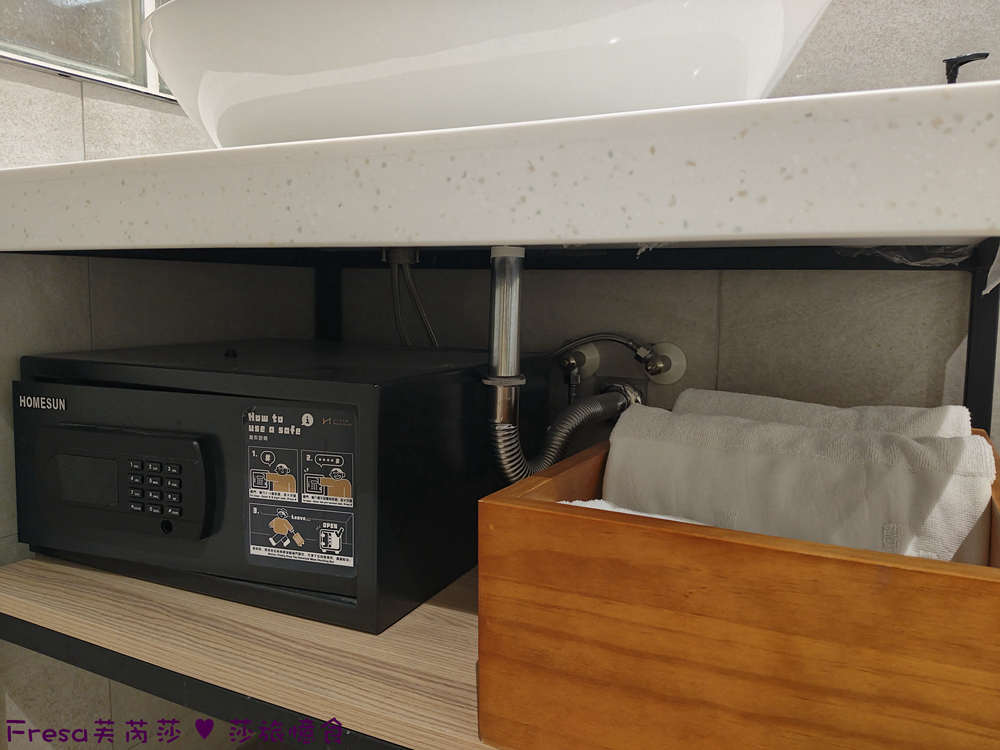 檯面下放有保險箱和大浴巾小毛巾.