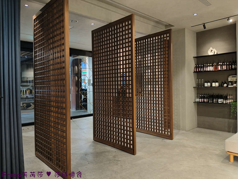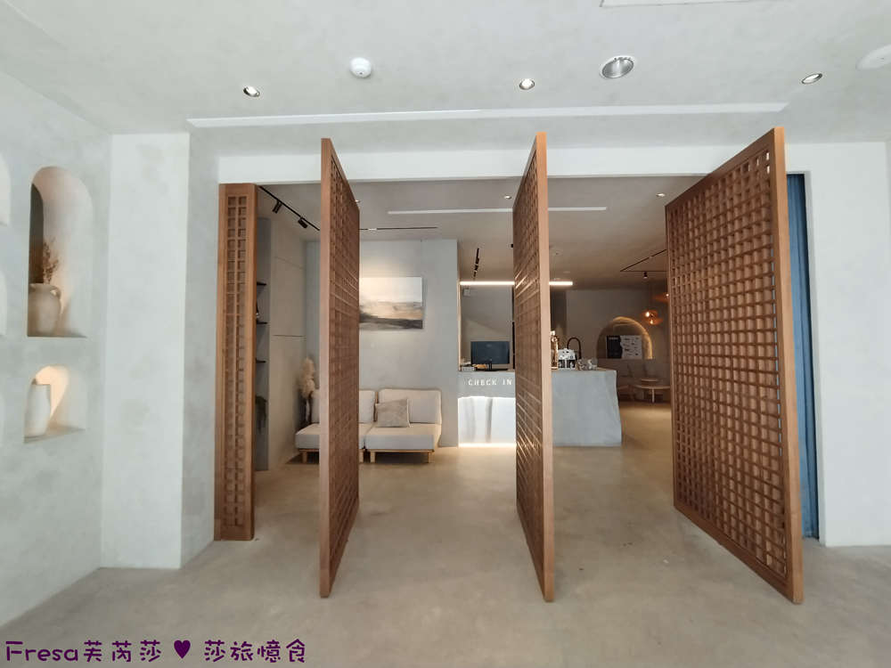 採用木質格柵巧妙的隔出門口玄關及接待櫃檯.