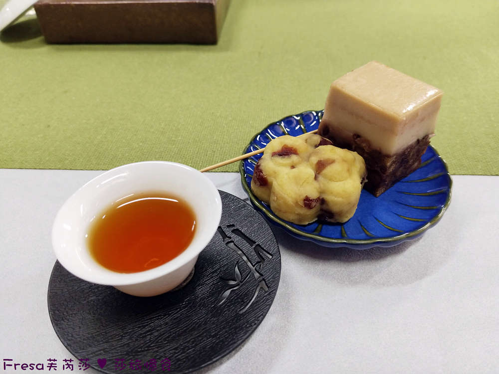 精選茶點是覆盆莓綠豆糕及紅豆糕點.